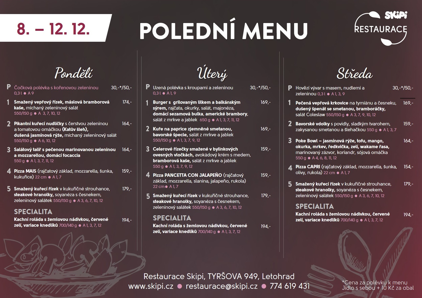 Polední menu vaříme každý všední den od 11 do 14 hodin. V čase obědů vybírejte z poledního menu a dále polévky, dětská jídla a pizzy ze stálého jídelního lístku.