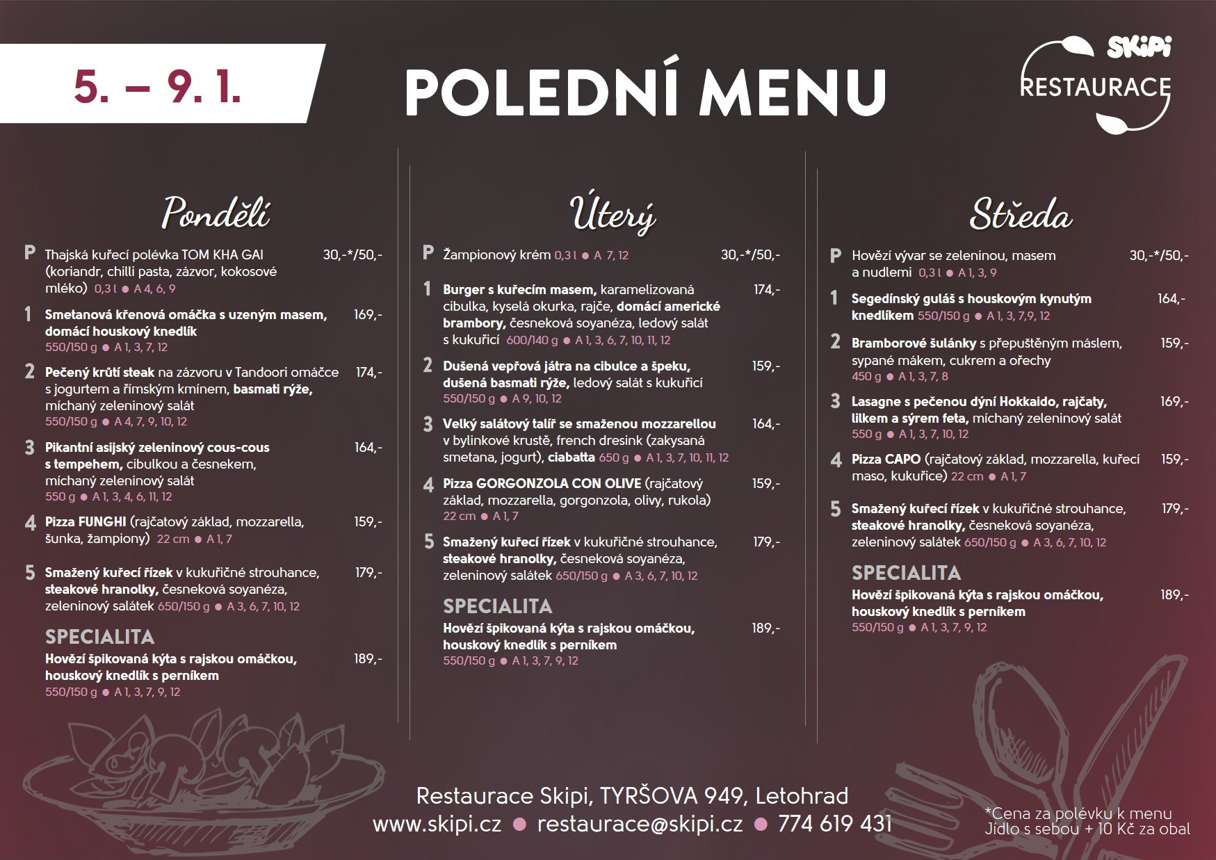 Polední menu vaříme každý všední den od 11 do 14 hodin. V čase obědů vybírejte z poledního menu a dále polévky, dětská jídla a pizzy ze stálého jídelního lístku.
