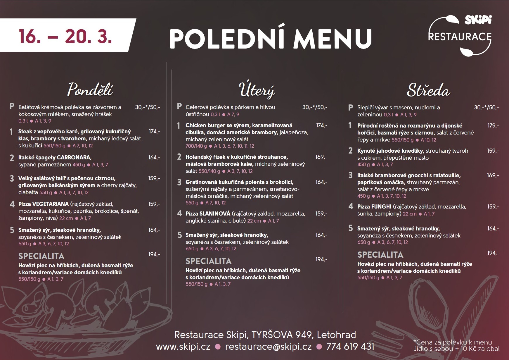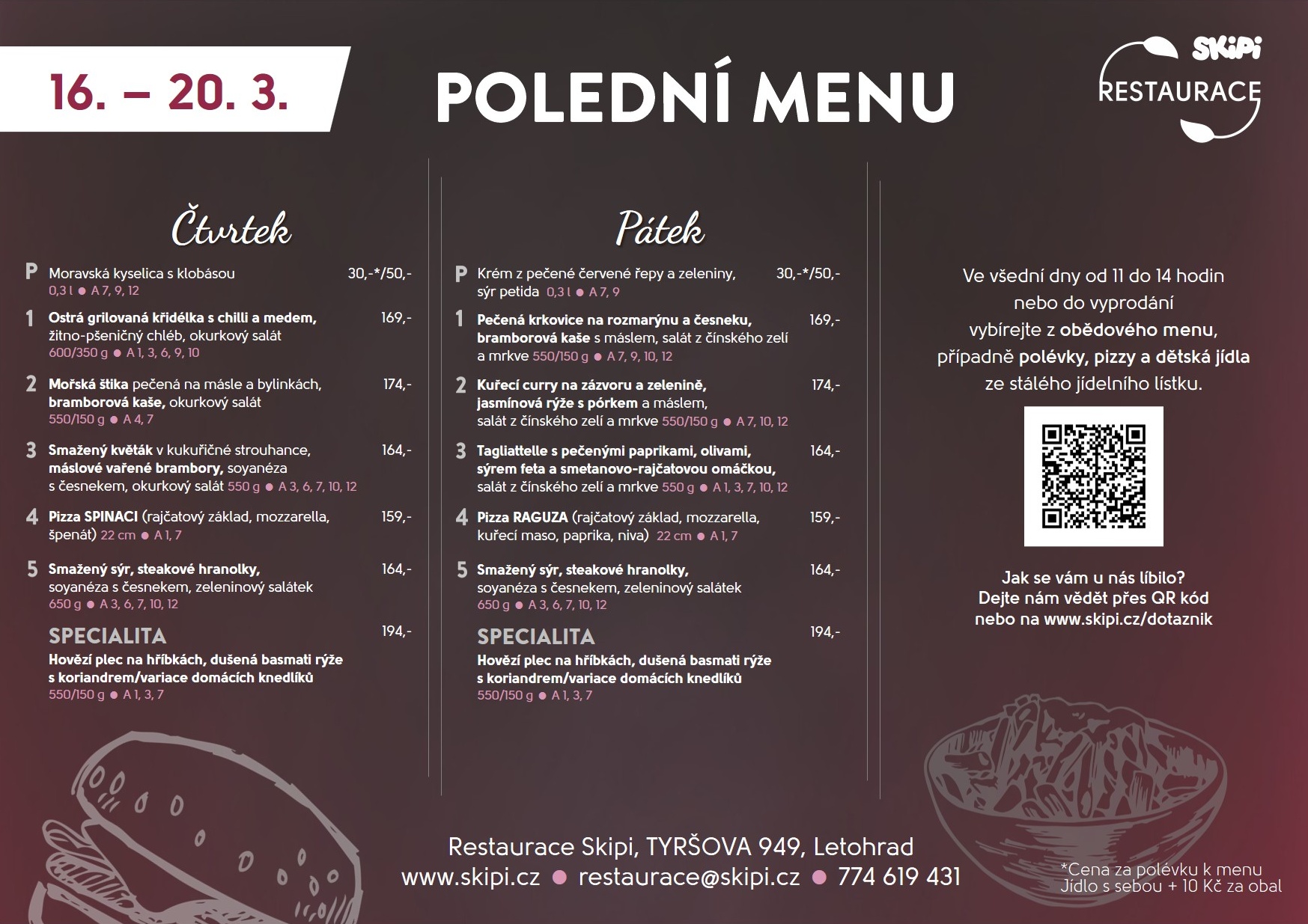 Polední menu vaříme ve všední dny od 11 do 14 hodin. V čase obědů vybírejte z poledního menu a dále polévky, dětská jídla a pizzy ze stálého jídelního lístku.