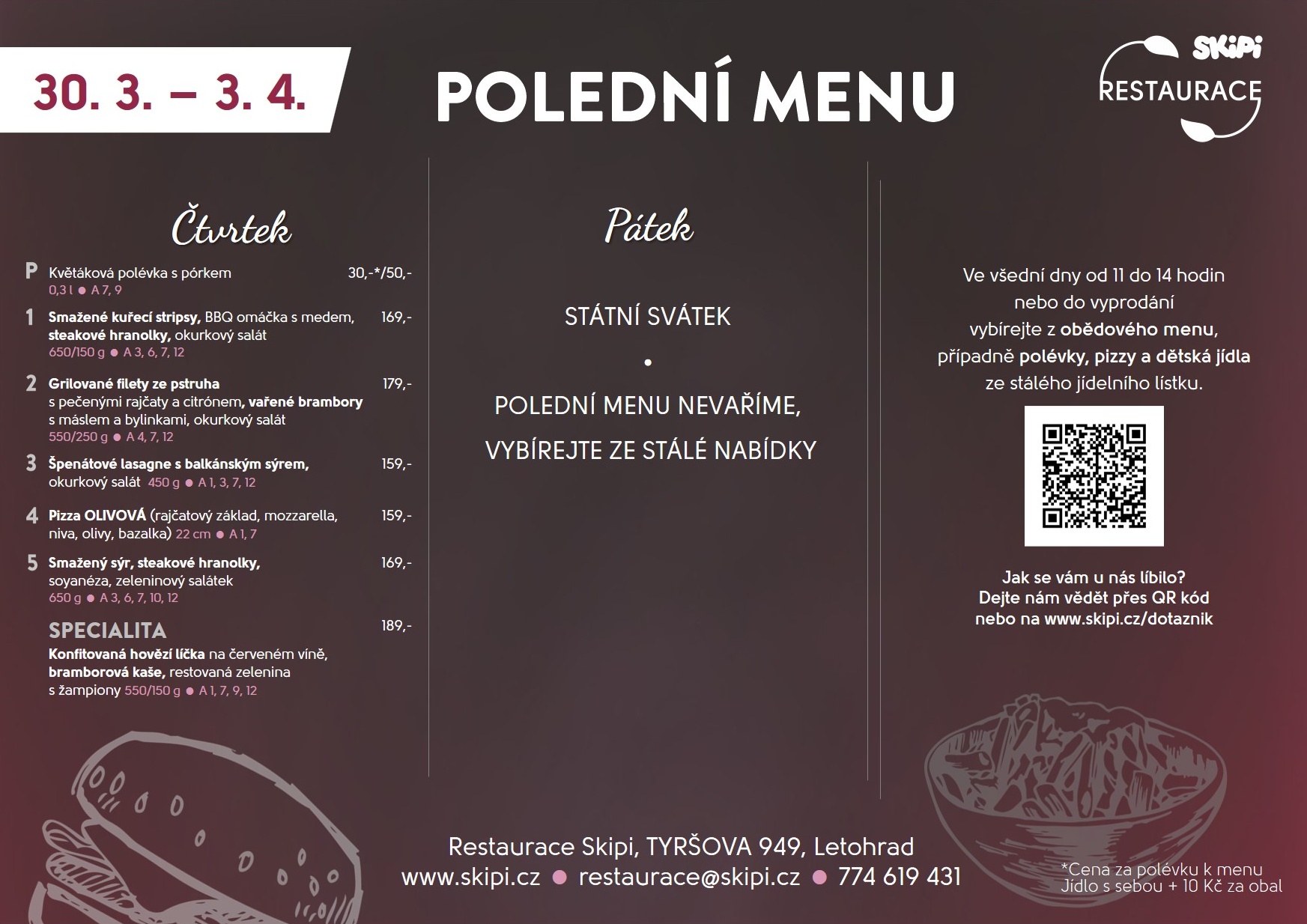 Pozor, v pátek polední menu nevaříme - je státní svátek. Ale otevřeno máme a můžete si vybrat z naší stálé nabídky.
